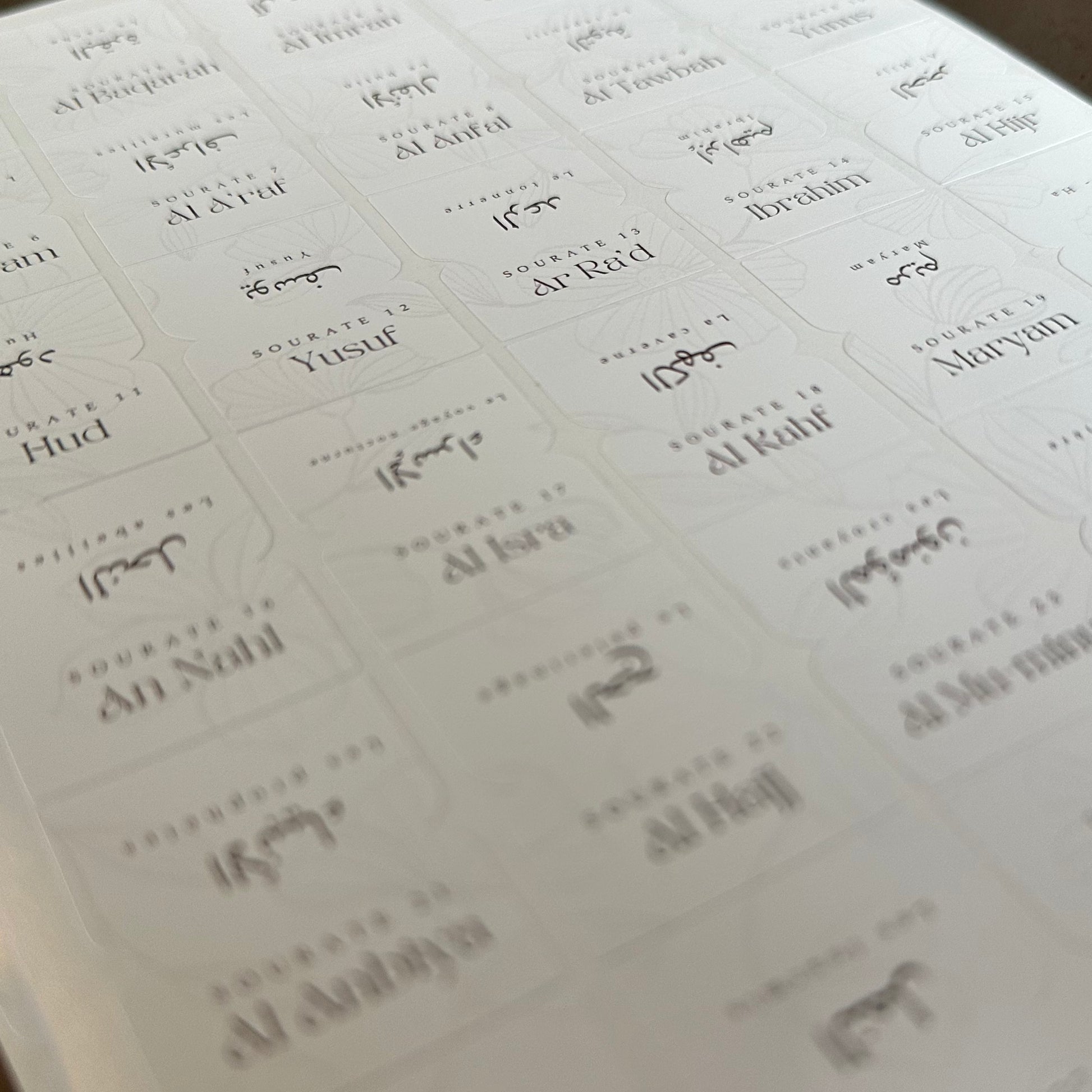 Onglets Sourates : Optimisez votre apprentissage du Coran grâce à ces onglets conçus pour une organisation claire et efficace. Chaque onglet indique le nom de la sourate en arabe, en phonétique et en français, ainsi que son numéro, facilitant ainsi votre navigation.