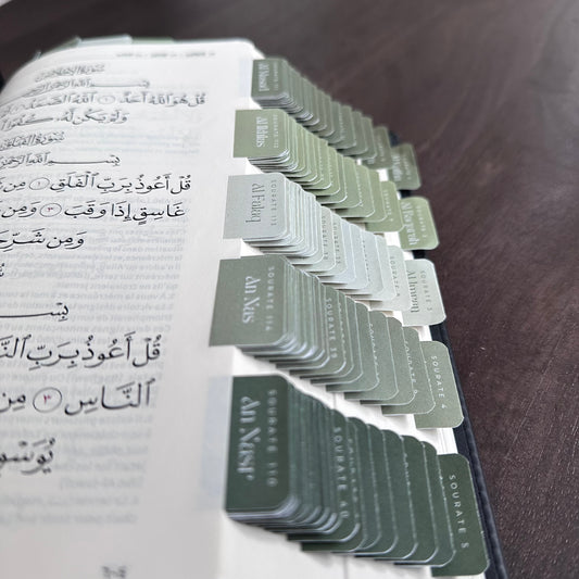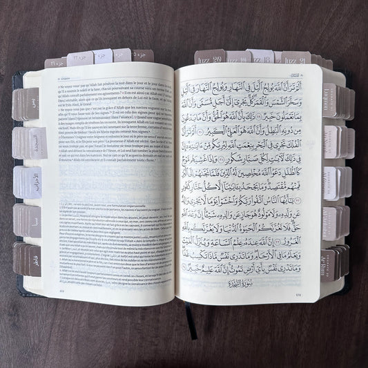 Commande-le dès maintenant et reçois ton Coran prêt à être lu, sans tracas ! Plus besoin de te soucier de la pose des onglets, il est déjà parfaitement préparé pour toi.